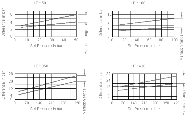 The above graphs show the variation range for resetting of the Pr. Switch. E.g. When 1PS100-** pr. switch is Set at 80 bar rising pressure signal, the pr. switch will reset anywhere between 71 [80-9] bar to 75 [80-5] bar. Similarly If the Pr. Switch is set for falling pressure signal the variation range is applicable to rising pressure at which the pressure switch resets.