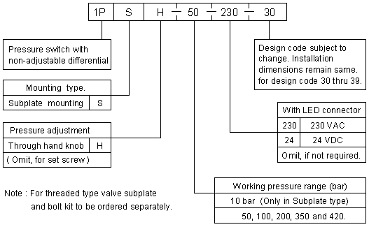Non adjustable differential type. Spring loaded sealed piston construction. Encapsulated design for protection against dust. Six pressure ranges available, which can be adjustable upto 10, 50, 100, 200, 350 and 420 bar. Transparent plug-in connector is available with LED